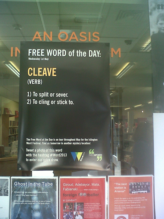 And have you found a Free Word of the Day yet? Here’s yesterday’s poster and first word CLEAVE – 1. To split or sever 2. To cling or stick to.