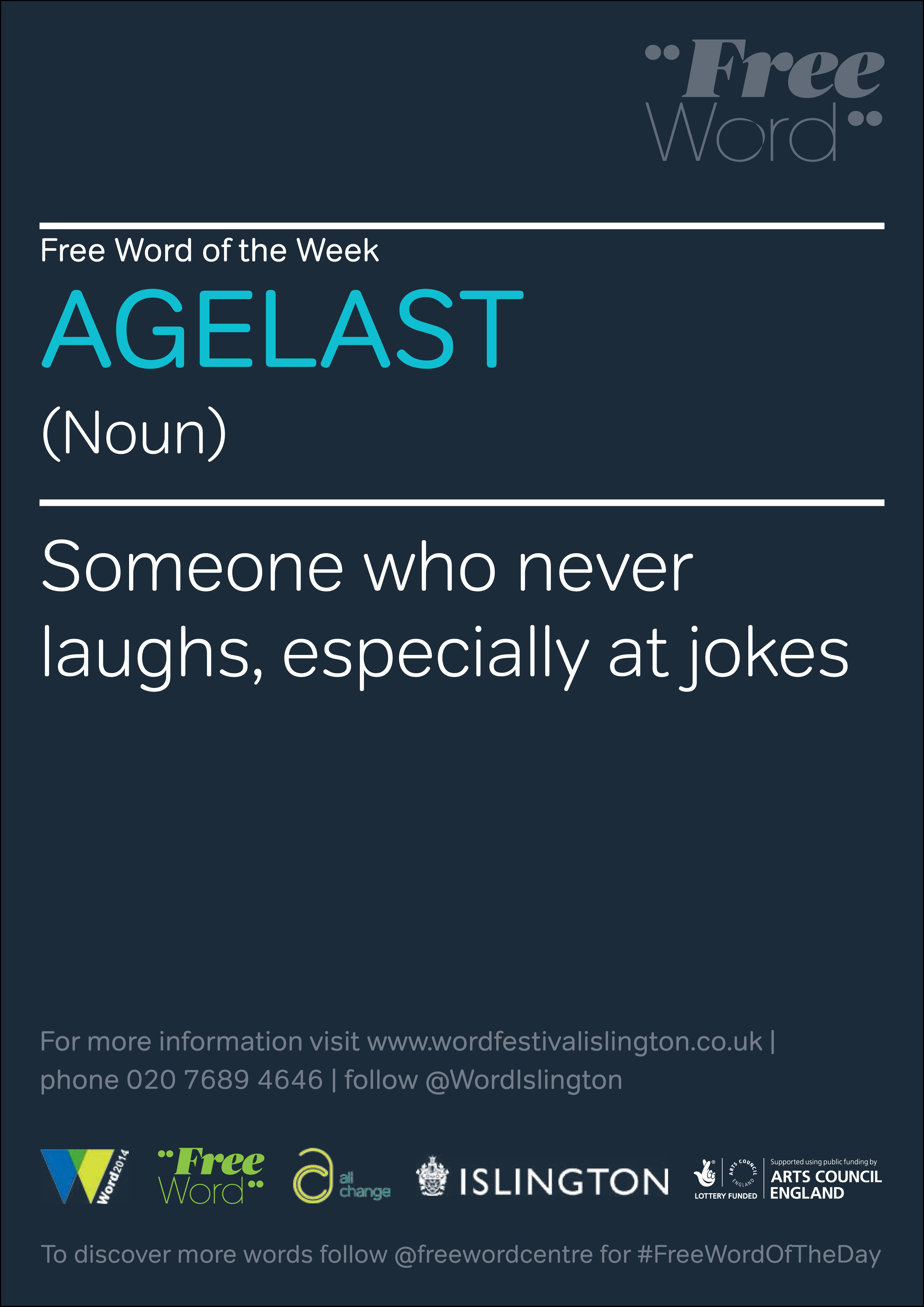 Enjoy a special weekly treat during Word2014 – a Free Word from Free Word Centre -Broaden your lexical horizons with a new word each week! Look out for posters in selected venues featuring some of the best words our alphabet has to offer. Snap a selfie with the Free Word of the Week posters, tweet it with the hashtag #FreeWordOfTheWeek and you’ll be entered into a prize draw! For more information visit: www.freewordcentre.com/freewords